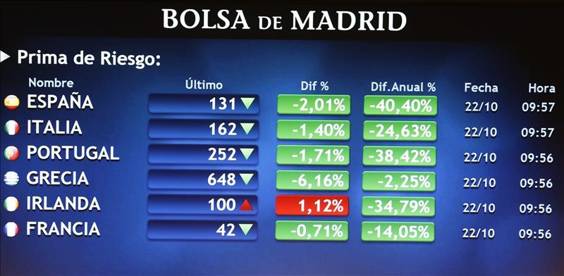 Madrid, 22 oct (EFE).- La prima de riesgo española ha cerrado la sesión de hoy sin cambios, en 134 puntos básicos, a pesar de que el rendimiento del bono nacional a diez años se ha elevado al 2,206 %, desde el 2,188 % previo.