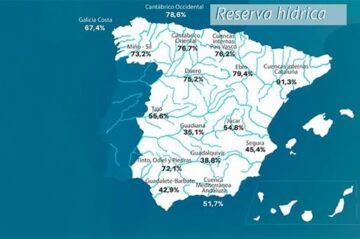 La reserva hídrica española está al 55 por ciento de su capacidad total. Los embalses almacenan actualmente 30.606 hectómetros cúbicos (hm³) de agua, disminuyendo en la última semana en 985 hectómetros cúbicos (el 1,8 por ciento de la capacidad total actual de los embalses).