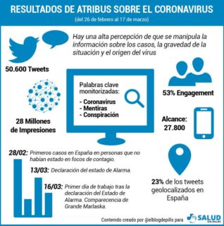 Por otra parte, el Instituto #SaludsinBulos ya había editado el Informe sobre bulos del coronavirus, con la colaboración de la Sociedad Española de Medicina Preventiva, Salud Pública e Higiene (SEMPSPH). Este documento monitorizó Twitter durante un mes (23 de enero a 26 de febrero) y sirvió para conocer el pensamiento de los españoles sobre esta nueva enfermedad. En este primer informe los bulos con más impacto fueron la relación entre el virus y los paquetes procedentes de China o los supuestos remedios para combatir la infección.