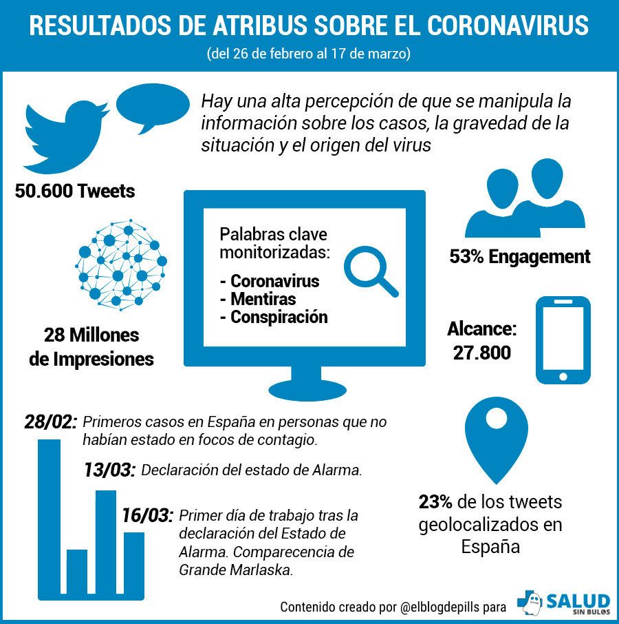Las teorías de la conspiración centran gran parte de la conversación sobre el coronavirus (SARS-CoV-2) en Twitter, según un nuevo análisis realizado por el Instituto #SaludsinBulos con la herramienta de monitorización Atribus. Así, las principales tesis sobre las que más se habla en esta red social son las mentiras de los gobiernos y las conspiraciones como el origen del virus o el propósito del mismo. “El aumento de los positivos por COVID-19 ha supuesto un incremento de la conversación en internet sobre esta enfermedad. La mayoría de los usuarios aluden a la manipulación por parte de los gobiernos, los medios de comunicación y los partidos políticos”, explica Carlos Mateos, coordinador de #SaludsinBulos y director de la agencia COM Salud.