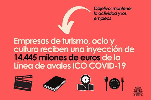 Según la información facilitada por el ICO en su informe de seguimiento quincenal, con datos actualizados a 31 de julio de 2020, 111.080 empresas del sector del turismo, ocio y cultura han recibido 14.445,4 millones de euros en financiación gracias a la Línea de Avales del Estado que el Gobierno aprobó el 17 de marzo para ayudarles a hacer frente al impacto social y económico provocado por la COVID-19, facilitando su acceso al crédito y a la liquidez.