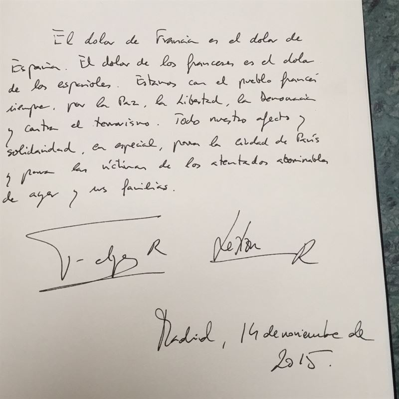 «El dolor de Francia es el dolor de España. El dolor de los franceses es el dolor de los españoles. Estamos con el pueblo francés, siempre por la paz, la libertad, la democracia y contra el terrorismo. Todo nuestro afecto y solidaridad , en especial, para la ciudad de París y para las víctimas de los atentados abominables de ayer y sus familias», dejó escrito el monarca en el mencionado libro.