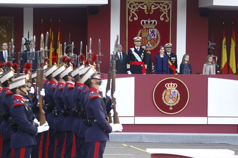 Los Reyes Felipe y Letizia presiden desde las once de la mañana en la plaza de Cánovas del Castillo de Madrid, también conocida como plaza de Neptuno, el desfile militar con motivo de la Fiesta Nacional bajo un cielo que amenaza lluvia.