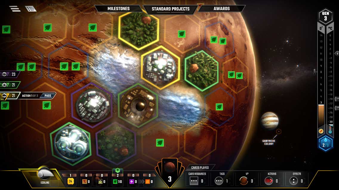 «Terraforming Mars» (Terraformación de Marte, en español) envía a los jugadores a Marte. Allí compiten para hacer que el hostil planeta sea habitable para la humanidad. Lo que es divertido en la versión de mesa también lo es en la implementación digital, que presenta la acción de una manera agradable y fácilmente comprensible.