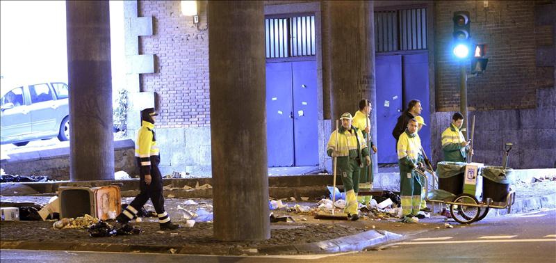 También han ardido nueve contenedores desde la noche del pasado viernes con motivo de esta huelga de limpieza viaria y jardinería de Madrid, que siembra las calles de basura y desperdicios en los seis días que se lleva celebrando.