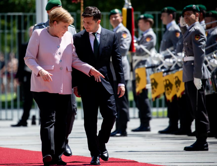 Merkel ha recibido este martes en Berlín a Zelenski. Durante la formación de honor de las Fuerzas Armadas, y mientras sonaban los himnos de ambos países, la canciller alemana comenzó a temblar, si bien estos movimientos remitieron cuando comenzó a andar.
