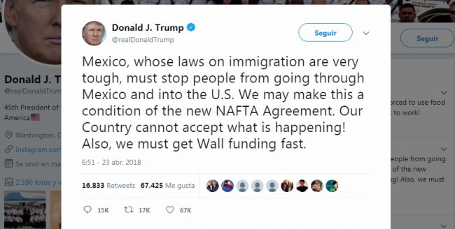 «México, cuyas leyes migratorias son muy duras, debe frenar a la gente que atraviesa México hacia Estados Unidos. Podríamos hacer de esto una condición para el nuevo acuerdo sobre Nafta», escribió Trump en Twitter. «¡Nuestro país no puede aceptar lo que ocurre! Tenemos que obtener financiación para el muro rápidamente», añadió.