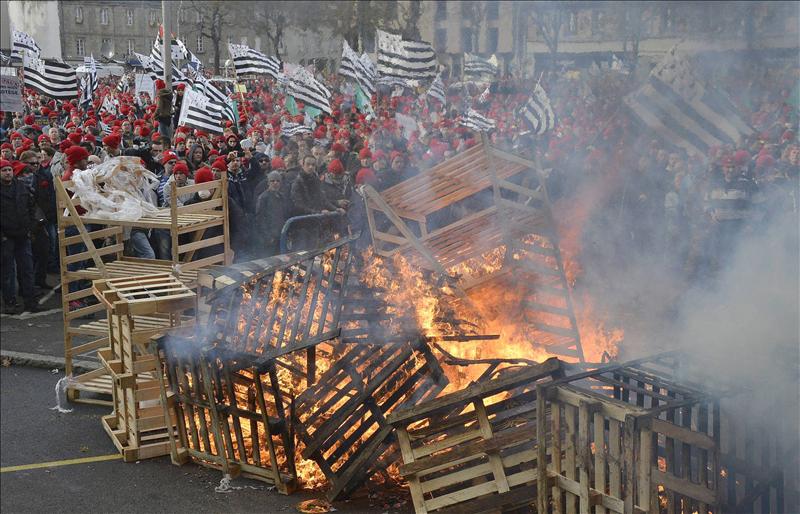 París, 2 nov (EFE).- Miles de personas se manifestaron hoy en Bretaña, en el noroeste de Francia, contra la política del Ejecutivo, en favor de las medidas por el empleo y en contra del impuesto que prevé tasar a los camiones que circulen por las carreteras francesas.