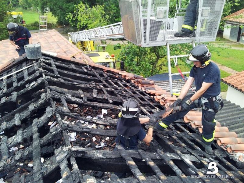 A las 07.52 horas dieron el incendio por controlado y solicitaron que se movilizase la autoescalera del parque de Cangas de Onís para poder realizar tareas de ventilación y desescombro del tejado que ha quedado muy dañado.