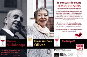 La Fundació Casa Museu del Consell de Mallorca i el Consell Regulador de la DO Binissalem convoquen la primera edició del concurs de relats Temps de Vins, a través del projecte WOW Mallorca i en el marc de les activitats dels Wine Days 2017. El relat seleccionat serà publicat juntament amb els de dos autors de reconegut prestigi–Llorenç Villalonga i Maria Antònia Oliver– en una edició especial de llibres/botella per a col·leccionista, amb els Vins Seleccionats 2017 de la DO Binissalem.