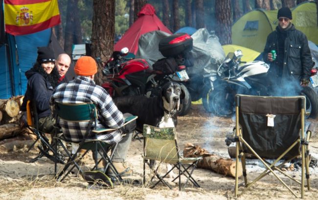 Se preveía temporal y entre algún copo de nieve que otro se levantaba el campamento en el pinar, se encendían las hogueras y comenzaban a llegar motos y más motos de todos los puntos de España y del extranjero, como franceses, portugueses, italianos y hasta “Soonki” de Corea del Sur, quien se había encontrado con “Manu” procedente de Burdeos con cinco amigos y le habían hablado de la concentración, así que este coreano pensó ¿Por qué no?, y allí estuvo todo el fin de semana contando anécdotas de su viaje alrededor de las hogueras que calientan el alma de la Leyenda.