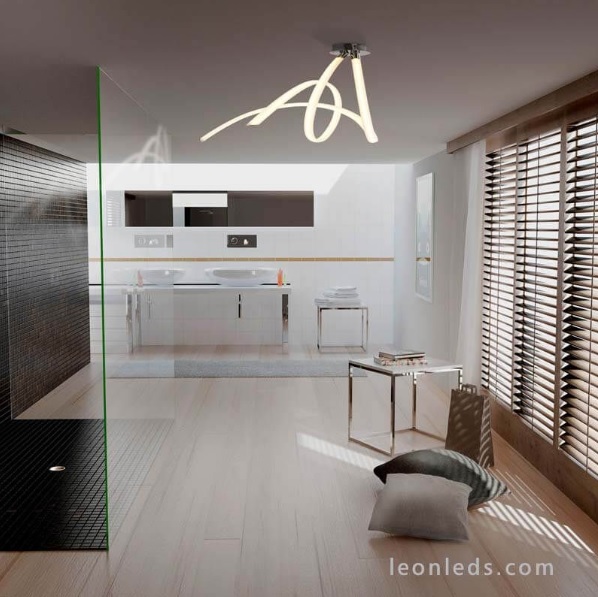 Una de las series que cumple por completo con este precepto es Armonía, una colección diseñada por José I. Ballester, en la que las lámparas de techo se presentan con tubos con tiras de led en su interior, curvados, entrelazados y fijos.