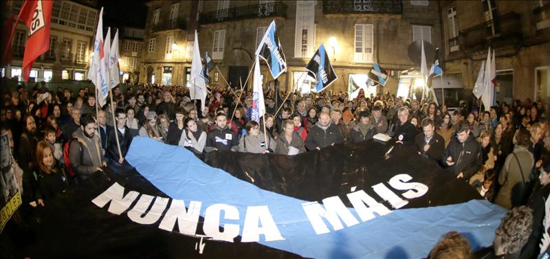 En Vigo, otras mil personas se han concentrado ante el museo Marco, con una pancarta -‘Nunca Máis. Dignidade’- y han protagonizado una pequeña manifestación por las principales avenidas, al son de los tambores y de una banda de gaitas.