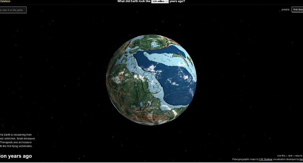 Además, en la parte superior central de la página se puede viajar en el tiempo. El usuario puede establecer cuántos millones de años quiere retroceder para ver cómo estaba distribuida el agua y la tierra en ese momento. Es posible elegir numerosos escenarios entre cero y 750 millones de años.