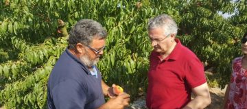 El consejero de Desarrollo Rural y Sostenibilidad del Gobierno de Aragón, Joaquín Olona, ha visitado este lunes la localidad oscense de Ballobar para conocer sobre el terreno los daños ocasionados por el pedrisco en las últimas semanas. Una adversidad climatológica que se ha unido a unos bajos precios de la campaña y que ha puesto a los fruticultores en una complicada situación.