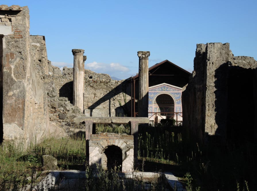 Muscolino, uno de los arqueólogos que trabajan en Pompeya, conduce por callejones soleados donde el pasado se convierte en presente. Los altos techos de las estancias de las casas romanas dan una idea de la riqueza de sus habitantes hace casi dos milenios: sofisticados frescos y mosaicos cubren las paredes y los suelos.