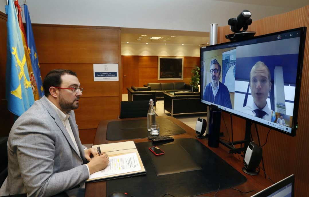 El Presidente del Principado, Adrián Barbón, ha mantenido una videoconferencia con el director general de la Corporación Alimentaria Peñasanta (Capsa), José Armando Tellado, y el consejero de Desarrollo Rural, Agroganadería y Pesca, Alejandro Calvo.