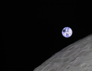 La foto muestra en primer plano la parte trasera de la Luna, oscurecida por cráteres, y en el fondo la Tierra azul con una flecha negra arriba a la izquierda.