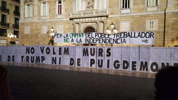 El martes 28F tuvo lugar la primera concentración de la campaña “Por la unidad del pueblo trabajador. No a la independencia”, que convoca Recortes Cero. La concentración se ha realizado en torno a un “muro” que los convocantes han levantado frente a la Generalitat, con la frase “No volem murs ni de Trump ni de Puigdemont” (No queremos muros ni de Trump ni de Puigdemont) en la Plaza Sant Jaume de Barcelona.