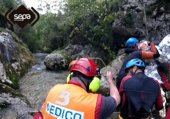 La mujer estaba en la parte inferior del barranco, en el río. El médico-rescatador le redujo la luxación de hombro. A continuación, con el triángulo de rescate, se ejecutó otra operación de grúa, con la que se izaron hasta el helicóptero al médico-rescatador y a la afectada. Posteriormente, se izó al bombero-rescatador que también estaba en tierra. A continuación se evacuó a la mujer lesionada al Hospital Comarcal de Arriondas.