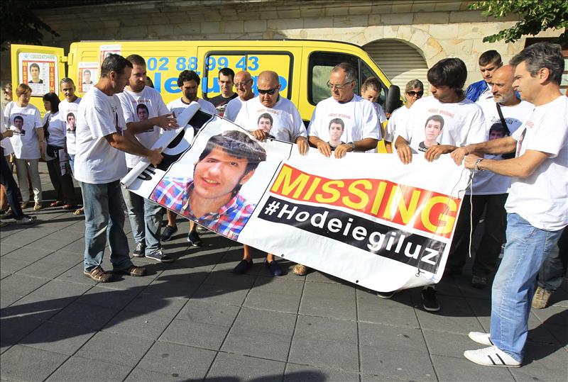 Los integrantes de la concentración han portado una pancarta en la que se recuerda que Hodei Egiluz lleva 300 días «missing» (desaparecido).