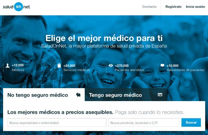 SaludOnNet, la plataforma eHealth 360º, estrena nueva imagen y se convierte en el mayor market place de salud en España, al incluir en su portal a las personas que no tienen seguro médico privado. Se trata de un gran salto cualitativo, con el que se ponen a disposición de todos los usuarios de la plataforma los servicios de más de 12.000 médicos. Asimismo, quienes lo utilicen van a contar con una oferta que supera los 24.000 servicios asistenciales en todo el país.