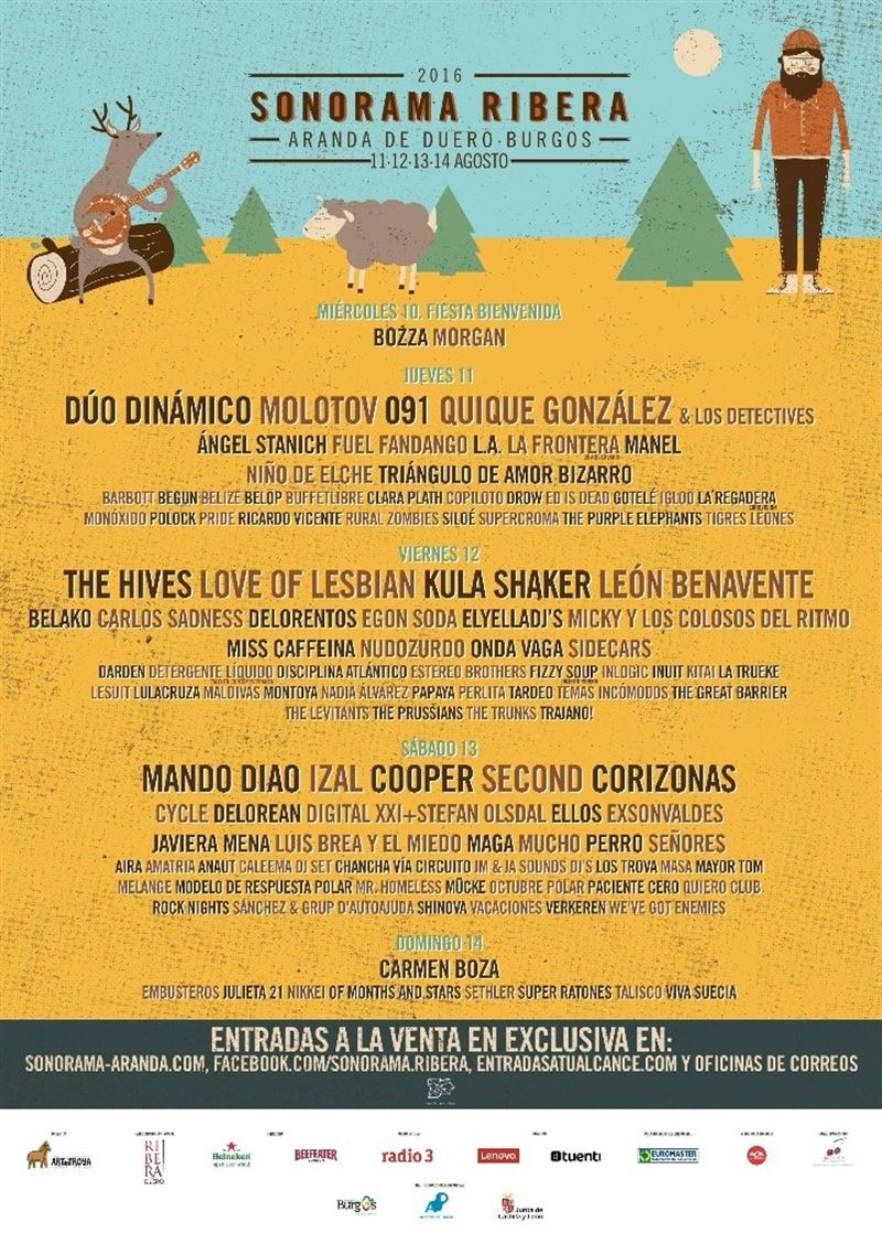 Sonorama Ribera suma a su cartel a Fuel Fandango, L.A., Cooper, Delorean, Digital XXI & Stefan Oldsal, Maga, Micky y Los Colosos del Ritmo, Aira, Amatria, Anaut, Belop, Bozza, Carmen Boza, Dardem, Ed Is Dead, Embusteros, Estereo Brothers, Fizzy Soup (ganadores del concurso Talento Ribera) y Gotelé.
