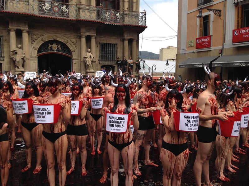 Los participantes se han desplazado a Pamplona desde Madrid, Barcelona, Valencia, Alicante, Estados Unidos, Suecia o Francia, para realizar un acto semidesnudos, con cuernos y bañándose en sangre artificial, para protestar contra el «maltrato animal», con el lema ‘Pamplona se baña de sangre’.