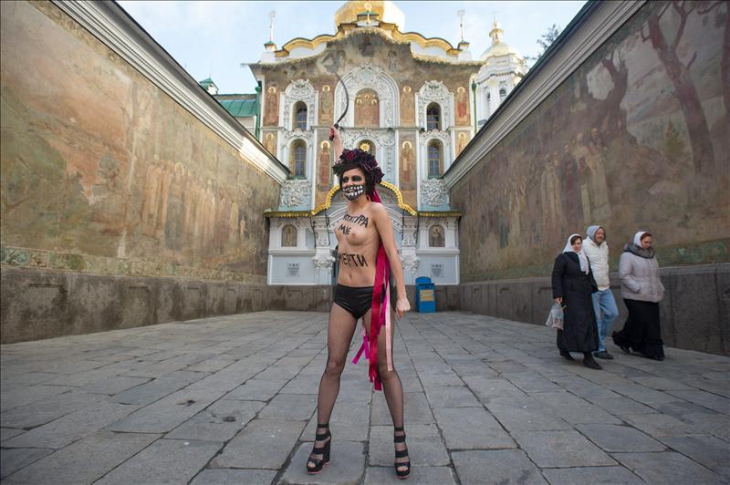La joven, que apareció en «top-less» y con una hoz en la mano, según la foto difundida por la organización feminista, simbolizaba a un «ángel de la muerte» que llamaba a los ucranianos a acabar con el régimen del presidente Víktor Yanukóvich.