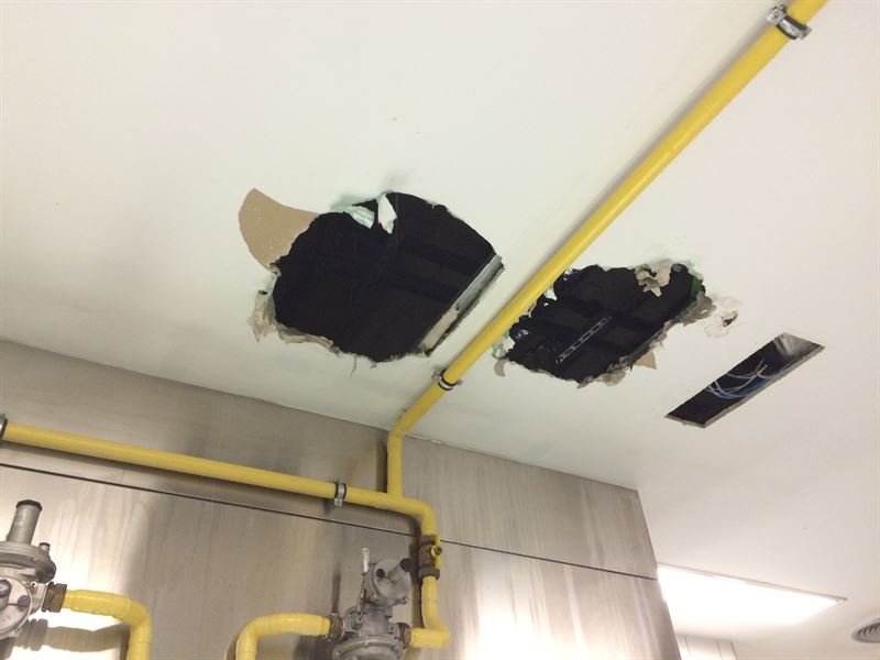 Una fuga de agua en una tubería ha provocado el hundimiento este viernes de parte de la techumbre de las cocinas del HUCA. Al parecer, el líquido fugado se fue acumulando hasta que cedió la escayola, provocando un agujero de considerables dimensiones.