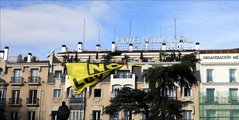 Mientras, enfrente, en la fachada del hotel Villa Real, tres activistas de Greenpeace han tratado de desplegar una gran pancarta contra la ley, aunque la Policía se lo ha impedido finalmente rajando la tela y retirándola.